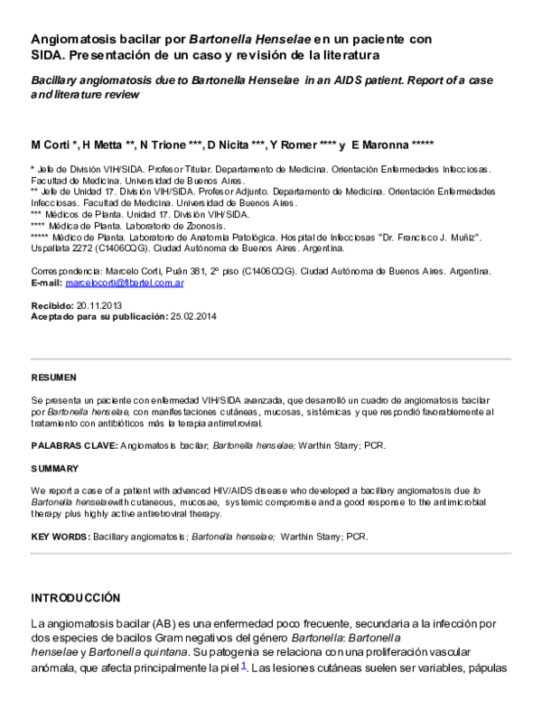 Pdf Bacillary Angiomatosis Due To Bartonella Henselae In An Aids Patient Report Of A Case And Literature Review Marcelo Corti Academia Edu