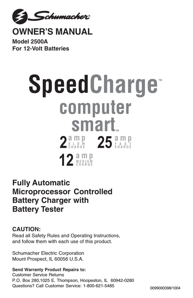 Schumacher Sc1325 250a 6 12v Battery Charger Engine Starter Owner S Manual User Manual